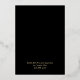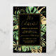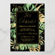 Cette invitation de célébration de mariage en fuite tropicale élégante présente des feuilles de palmier, de philodendron et de fougère vertes et dorées sur fond noir. Un cadre en feuille d'or élégant met en valeur le texte en feuille d'or. Des éclaboussures de feuille d'or accentuent ce design botanique exotique et apportent une touche de fantaisie moderne à l'invitation. "Célébrons !" ainsi que les noms des jeunes mariés sont indiqués en haut. Les détails du vœu de mariage et les informations sur la réception sont en dessous. Les informations de RSVP sont au dos de l'invitation.