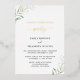 Invitation simple pour la réception de mariage uniquement, avec une typographie élégante et la mention "Happily Ever After Party" en véritable feuille d'or, accompagnée d'un brin de verdure d'eucalyptus dans le coin supérieur gauche et le coin inférieur droit. Le dos est d'une teinte de vert sauge assortie. Cette invitation moderne pour la réception de mariage est idéale pour un couple déjà marié qui souhaite célébrer avec ses amis et sa famille après s'être enfui.