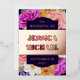 Design floral étonnant avec roses, pivoines, cosmos, dahlia et fleurs d'iris. Arrière - plan bleu foncé. Impression en or rose avec typographie florale pour les noms de Bride et Groom. Élégant lettrage. Violet, rose, blanc, jaune, rose vif, vert. Couleurs gras saturés. Design mariage moderne et festif à l'aquarelle.