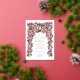 Illustration originale d'une arbor ou d'une treillis recouverte de roses roses avec quelques tournesols qui se jettent à l'horizon ; les accents de papier peint choisissent entre trois couleurs. Si vous voulez que tout le texte soit dans un papier d'aluminium, coupez et collez le calque de papier d'aluminium et changez la couleur en noir. Customisez la couleur arrière - plan sur l'avant et l'arrière. Ajoutez un code QR si vous le souhaitez à l'arrière pour le registre, le site Web, etc