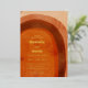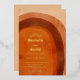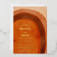 Faire-part de mariage Boho avec une arche abstraite peinte dans des couleurs terreuses du désert d'orange brûlé, de terre cuite, de rouille et de brun. Les détails de votre mariage sont dans une mise en page moderne avec vos noms dans une police de style rétro pour une tournure amusante. Tout le texte est imprimé avec de la feuille d'or réelle.