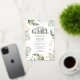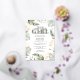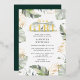 Invitation de baby shower sauvage, calme et élégante avec un animal de safari, effet doré et feuilles vertes.