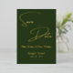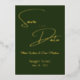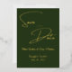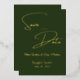 Ces cartes de sauvegarde de date en feuille d'or vert sont conçues dans un style moderne et minimaliste avec un monogramme pressé à la feuille et votre texte de choix sur un fond vert riche . Toutes les couleurs de fond, la couleur du texte et la couleur de la feuille peuvent être modifiées par vous dans l'outil de conception. Cette invitation de sauvegarde de date élégante est un choix sophistiqué pour tout mariage élégant.