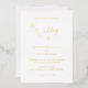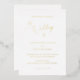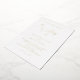 Faire-part de mariage blanc classique avec "le mariage de" et "réception à suivre" dans un élégant script délicat. Tout le texte est imprimé en feuille d'or véritable. Un aménagement simple sans aucun graphisme en fait un design intemporel et luxueux, parfait pour un mariage formel.