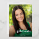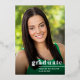 Cette carte de graduation simple et minimaliste comporte une couverture de typographie en feuille d'argent et une photo complète. Le mot "Graduate" est écrit en lettres minuscules en gras, en papier argenté tendance, avec le nom du diplômé et l'année de sa graduation ci-dessous. Le design typographique est placé dans le coin inférieur droit et recouvre une photo complète avec orientation verticale. Le verso de la carte de graduation comprend un modèle pour ajouter les détails de la fête de graduation.