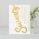 Soixante-dix simple fond blanc avec un texte en feuille d'or ou votre propre couleur de feuille. Personnalisez ce soixante-dixième anniversaire invitation artistique étape importante avec vos propres détails de fête d'anniversaire, et une photo de votre fille d'honneur au verso. D'autres années, couleurs et articles assortis sont disponibles. © Conception originale de Sarah Trett pour www.mylittleeden.com sur Zazzle.