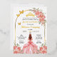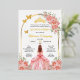 Esta tarjeta para fiesta de quinceanera tiene rosas rosas con color dorado y la imagen de una quinceanera con un bestido de princesa color rosa con dorado. Se puede personalizar con su nombre, el nombre de los padres, padrinos, la fecha y direccion de la fiesta.