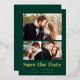 Cette simple et minimaliste carte Save the Date comporte un collage d'une photo horizontale et deux petites photos carrés au-dessus des mots "Save the Date" dans la typographie en gras et en or réel, suivie des noms du couple, date mariage et ville en sans serif police sur un arrière - plan vert émeraude. Ajoutez un message plus détaillé avec des informations supplémentaires sur l'inverse.