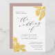 Invités Invitations à votre mariage d'été, de destination ou de plage avec ces invitations de mariage tropical chic avec des feuilles en fronde de palme tropicale en feuille d'or élégante. Vos détails mariages apparaissent dans un mélange de script de calligraphie, de serif et de typographie italique. Cartes inversées à tonalité terre solide rose taupe rose pour un look tropical chic.