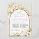 Des invitations bat mitzvah tropicales chic dans une palette de couleurs neutres séduisantes comprennent une arche rose en feuille d'or portant vos détails de cérémonie et de fête, accentuée de frondes de palmier vert pâle, feuillage de l'île de la plage, orchidées blanches, botaniques séchés et gazon de la pampa.