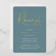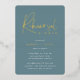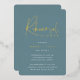 Invitations invités à célébrer le couple heureux avec ces invitations à dîner de répétition moderne et minimale avec des accents de papier de luxe. Un design simple propose un "dîner de répétition" en feuille d'or décontracté, avec les détails de votre événement sous un arrière - plan bleu turquoise poussiéreux.