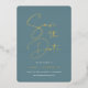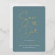 Invités Invitations à marquer leurs calendriers pour votre mariage avec ces modernes et minimes enregistrer les cartes de date. Caractéristiques de conception simple "enregistrer la date" en feuille d'or script manuscrit sur un arrière - plan bleu turquoise poussiéreux, avec vos noms, date mariage, emplacement et site Web en dessous. Ajoutez une photo fiançailles préférée orientée portrait à l'arrière.