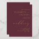 Cette faire-part de mariage moderne simple et élégante comprend le mot "mariage" dans un style élégant en feuille d'or. Personnalisez-le avec les noms de la mariée et du marié en lettres majuscules en feuille d'or serif (jointes par le mot "et" dans le script qui correspond à "mariage") et le texte restant en italique minuscule sur un arrière - plan bordeaux.