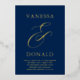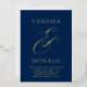 Faire-part de mariage moderne avec un agencement simple et minimal avec vos noms et une élégante esperluette dans un grand format au-dessus de vos détails de l'événement. Tout le texte à l'avant est dans un vrai papier d'aluminium sur un arrière - plan bleu marine et peut être modifié dans l'outil d'édition de conception.