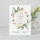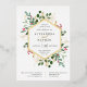 Ce magnifique faire-part de mariage de vacances dispose d'un cadre géométrique en feuille d'or avec feuilles or assortis, la verdure de Noël, et des baies sèches rouges sur un arrière - plan blanc simple. Parfait pour votre mariage d'hiver élégant.