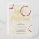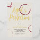 Invitation de soirée de dégustation de vin en feuille d'or sur fond ivoire avec taches de verre de vin bordeaux et écriture pinceau stylée. Invitation sur le thème du vin vieilli à la perfection, parfaite pour les soirées d'anniversaire et de dégustation de vin avec détails en feuille d'or et taches de vin rouge.