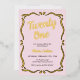 Twenty One Gold Script Blush Pink 21st Birthday Foil Invitation présente un design de typographie noir simple avec un cadre dessiné à la main et à l'aide d'un cadre de luxe, dessiné à la main, sur un arrière - plan rose pâle, créant un look moderne et sophistiqué. Le script déjoué "vingt et un" et le nom personnalisé ajoutent une touche élégante et élégante. Parfait pour une fête de 21e anniversaire pour elle, cette invitation mélange simplicité chic avec une touche de glamour girly, ce qui en fait un choix idéal pour célébrer ce jalon dans le style. Entièrement personnalisable. Modifiez les détails pour correspondre à votre événement et créez l'invitation parfait! Besoin d'aide ? Cliquez sur le bouton "Message" ci-dessous. Nous sommes heureux de vous aider dans les changements de conception.