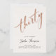 A white and rose gold, glam, modern, elegant and chic 30th birthday party invitation template featuring the word "thirty" covered in real rose gold foil, modern calligraphy script and typography in charcoal black. A chic, modern minimalist design for a woman on her thirtieth birthday.