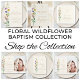 This floral Baptism invitation features watercolor wildflowers and a cross in gold foil on a soft cream background.