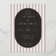 This elegant foil invitation features a classic oval design set against a striped background, creating a sophisticated and timeless look. The color palette includes soft beige stripes with a dark central panel, enhancing the luxurious feel of the foil effect. The typography is clean and modern, with customizable text fields for personal details, making it perfect for weddings or formal events. The overall mood is refined and inviting, ideal for celebrating significant life moments in style.
