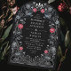 Elegant, whimsical, and gothic wedding design perfect for an enchanted forest-themed celebration or a moody and dark gothic affair. This design features ravens set in a frame of green vines, red and black roses, berries, and silver accents against a black background. Matching Items in our shop for a complete party theme. Please note that the silver on the invitation is NOT real foil and is printed in flat colors.