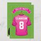 Des invitations à la fête d'anniversaire à thème de football avec un arrière - plan de terrain de football vert, une chemise de sport rose avec votre nom et votre numéro, un ballon de football et un modèle de fête moderne.