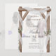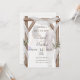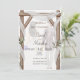 Une élégante invitation de mariage avec une arche en bois rustique, des rideaux blancs et un en-tête "Bismillah".