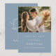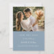 Élégante invitation Enregistrer la date de mariage photo bleu poussiéreux. Personnalisez avec vos noms, date et photo de mariage préférée. Le verso de la carte présente une couronne botanique feuillue entourant les initiales monogrammées de la mariée et du marié sur fond bleu poussiéreux.