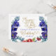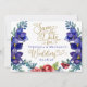 Carte postale faire-part de votre date mariage avec un script d'or manuscrit fantaisiste avec des coeurs entourés de fleurs d'aquarelle violette et rouge.