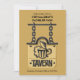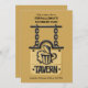 Une belle invitation "pour homme" avec un panneau de taverne représentant une chope de bière. Le fond est doré foncé et le panneau est d'un doré plus clair et il est suspendu à une épaisse chaîne noire. Parfait pour une célébration masculine.