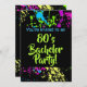 Organisez une fête d'enterrement de vie de garçon ou une soirée entre hommes sur le thème des années 80, dernier envol avant le mariage ! Design éclaboussé de peinture hip, frais et génial dans des couleurs vives et brillantes de violet, vert, bleu et jaune sur un fond noir à fort contraste. Idéal pour une soirée à thème rétro années 80. Œuvre d'art expressionniste abstraite dans une palette de couleurs super vives. Personnalisez-la avec votre nom ou votre texte !