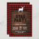 Invitation rustique pour un enterrement de vie de garçon avec la silhouette blanche d'un cerf, carreau buffalo rouge et grain de bois. Invitation pour un enterrement de vie de garçon avec un motif à carreaux buffalo rouge avec des polices cool et un grain de bois imprimé. Invitation pour un enterrement de vie de garçon avec un motif à grain de bois avec un cerf blanc et un fond à carreaux rouge et noir.