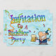 Papier bleu clair froissé comme arrière-plan avec wordart en couleurs arc-en-ciel décoré de serpentins en papier orange et vert invitant la bande à une fête de bachelor. Pour couronner le tout, il y a un type de dessin animé comique portant un chapeau de fête et tenant un stein plein de bière, avec plus de serpentins volant autour de lui. Un design amusant pour une occasion heureuse.