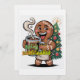 Un bonhomme en pain d'épice de style cartoon joyeux, représenté avec un large sourire enthousiaste et des joues roses. Il porte un simple tablier blanc et tient chaleureusement une tasse transparente remplie de café sombre et fumant, avec un panache de vapeur proéminent s'élevant vers le haut. Le texte « Épicé et Caféiné » est intégré de manière créative sur la tasse à café dans une police multicolore audacieuse et vibrante, comportant des embellissements subtils en forme d'étoiles et de flocons. En arrière-plan, un sapin de Noël vert minimaliste mais festif est orné de boules rouges et dorées, surmonté d'une étoile, et émettant de faibles rayons de lumière jaune. Le style général est net, joyeux et graphiquement fort, avec des contours clairs.