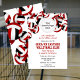 Couleurs rouges et noires de l'équipe volleyballs accent le bord supérieur de cette invitation à thème volleyball pour une célébration d'équipe. Un groupe de volleyballs rouges, noirs et blancs plus grands couvre entièrement l'arrière de l'invitation - téléchargez le logo de votre équipe pour personnaliser davantage ce banquet de fin de saison / cérémonie de remise des prix faire-part - par katz_d_zynes