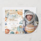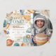 Space 1st Birthday Photo Invitation. Amusez-vous avec cette Invitation Space 1st Birthday! Parfait pour le premier voyage de votre petit astronaute autour du soleil, ce design éditable comprend des fusées, des planètes, des étoiles et un arrière - plan de galaxie. Personnalisez en quelques minutes les détails de votre fête — idéal pour les célébrations de premier anniversaire sur le thème de l'espace. Envoyez numériquement ou imprimez à la maison pour un invitation hors du monde !