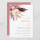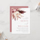 Bleu Ethérée et Faire-part de mariage bohème Bourgogne Faisant rayonner un mélange poétique de l'élégance de la nature, ce boho faire-part de mariage avec sa palette harmonieuse de teintes rousses et bordeaux. Une fleur blanche enchanteresse prend le devant de la scène, doucement encadrée par des roses dans un feuillage rose tendre et bordeaux riche. Le design est plus élevé avec des plantes en plumes, ajoutant une touche de grâce bohème. Placés sur un fond blanc immaculé, les noms de la mariée et du marié sont inscrits avec art dans un script romantique, avec les détails mariages soigneusement arrangés ci-dessous. Intégrant l'essence de l'amour et de la nature, cette invitation est un beau prélude à une célébration bohème sincère.