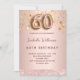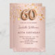 Une invitation moderne, élégante et glamour pour un 60ème anniversaire. Un arrière - plan métallique à l'apparence rose à l'or faux avec des étoiles à gouttes d'or faux. Le nom est écrit avec un rose moderne de couleur or foncé à la main écriture style. Personnalisez et ajoutez les détails de votre fête. Le numéro 60 est écrit avec une police de style ballon, script.