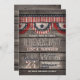 Invitation de la Retraite avec 4 juillet thème, drapeau américain, patriotique rouge, blanc et bleu étoiles et rayures design sur rustique vintage pays ouest, grange bois, arrière - plan imprimé en bois avec élégantes polices de style ancien. Parfait pour la campagne, la ferme, la ferme, le thème baryare Retraite Parties! Ce mignon et amusant invitation est idéal toute l'année pour les fêtes de retraite du printemps, de l'été, de l'automne ou de l'hiver !