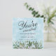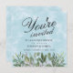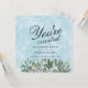Une belle aquarelle, peinte dans un design de ciel bleu, offre le décor de cette invitation... parsemée de jolis eucalyptus et de verdure, et finie avec un script de typographie simple et élégant. Votre client trouvera un arrière - plan d'aquarelle assorti sur le dos, avec tous les détails de la douche.