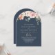 Ce faire-part de mariage espagnol fleuri rose de jardin d'eucalyptus est parfait pour un mariage rustique. Le design est composé de fleurs rose, blush, jaune rose avec des feuilles d'eucalyptus dans un arrière - plan bleu marine foncé.