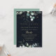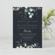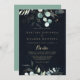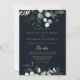 Ce faire-part de mariage espagnol doré à fleurs d'eucalyptus est parfait pour un mariage rustique. Cette conception artistique présente des feuilles d'or dessinées à la main et des feuilles d'eau vert eucalyptus dans un arrière - plan bleu foncé, inspirant beauté naturelle.