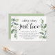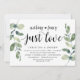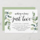 Carte d'invitation thématique Eucalyptus Rustique Moderne, Écriture Noire (avec titre de carte : Rien de fantaisiste, juste de l'amour). C'est parfait pour votre réception de mariage intime / fête de célébration post-mariage. Ajoutez vos détails dans une police / lettrage noir assorti.