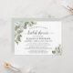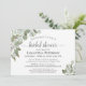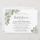 Cette belle invitation à la douche nuptiale présente une aquarelle peinte à la main avec des sprigs d'eucalyptus feuilles et de la verdure dans les tons menthe, mousse et vert sauge. Le titre est écrit en calligraphie script élégante et l'invitation contient des informations sur la douche, RSVP, et registre. Bonne façon de célébrer la mariée à être.