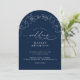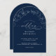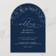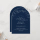 This arch-shaped wedding invitation features a deep navy blue background with white script text. thin line art eucalyptus springs add a soft and elegant botanical touch. The curved arch shape creates a modern and stylish look. This design is perfect for couples who want a refined, minimalist, and contemporary navy blue wedding theme.