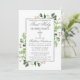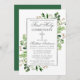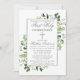 Moderne Elégant Première Sainte Communion Invitation inclut des feuilles d'eucalyptus aquarelle et d'autres beaux feuillage botanique verdoyant. Croix d'argent.