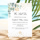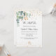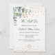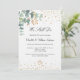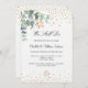 Un arrière - plan blanc chic. Décoré avec des feuilles d'eucalyptus couleur verte, des sprigs, de la verdure et un faux sprig d'or. Les coeurs dorés s'aspergent. Personnalisez et ajoutez vos noms et détails de cérémonie. Lettres noires. Retour : coeur doré.