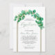 L'invitation au baptême présente une élégante arche décorée d'eucalyptus aquarelle, de specks dorés, de feuilles verdoyants et de branches.