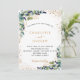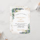 Un arrière - plan blanc décoré de verdure d'eucalyptus et de feuillage doré. Personnalisez et ajoutez vos noms et les détails du mariage. Lettres noires et dorées. Retour : ajoutez votre weburl à votre site mariage pour RSVP ou détails.