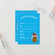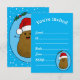 Adorable pomme de terre de dessin animé marrante, mignonne et joyeuse portant un chapeau de Père Noël rouge et blanc. La pomme de terre est dans un style d'art de dessin animé et colorée en marron, elle a des bras et des doigts en bâtonnets et un grand sourire heureux avec des points pour les yeux. Le chapeau de Père Noël sur sa tête est rouge avec une garniture blanche et un pompon blanc qui pend. Il est à l'intérieur d'une forme ovale bleu clair avec un cadre bleu foncé et deux feuilles de houx vertes avec deux baies rouges en haut de l'ovale. La couleur de fond est un bleu clair brillant avec des flocons de neige blancs flottant autour pour donner une atmosphère festive à ces mignonnes invitations saisonnières.